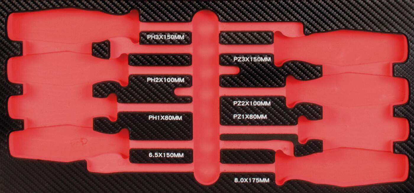 • 8-tlg. Werkstattwagen-Einlage mit den wichtigsten PH-, PZ- und Schlitz-Schraubendrehern