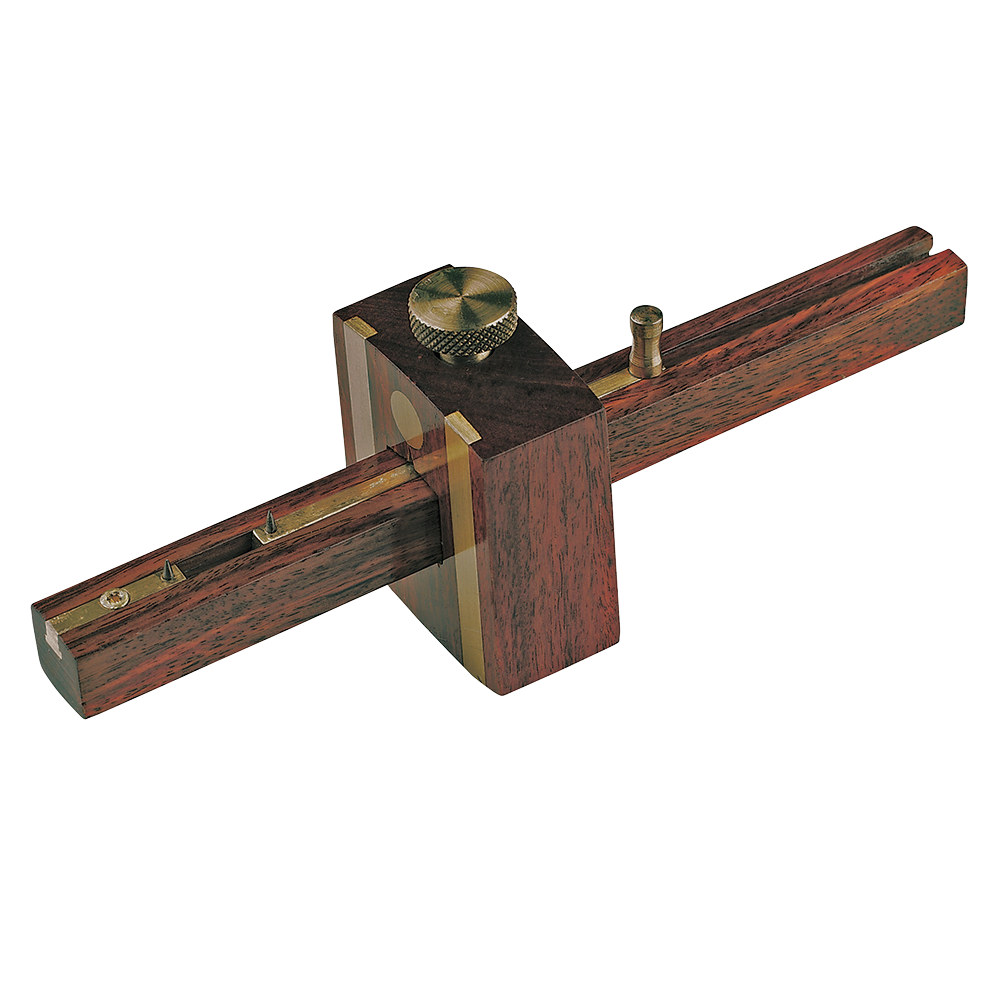 Hartholzkörper mit Messing-Rändelschraube. Messingbeschlag und -schenkel. Zwei gehärtete Anreißnadeln.