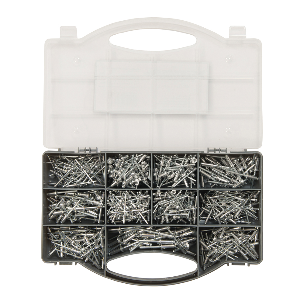 Verzinkte und sortierte Stahlnieten mit Aluminiumstift. Für Nietverbindungen in Holz, Metall und Kunststoff geeignet. Größen: 3,2 x 6 mm, 3,2 x 8 mm, 3,2 x 10 mm, 3,2 x 12 mm, 4,0 x 6 mm, 4,0 x 8 mm, 4,0 x 10 mm, 4,0 x 12 mm, 4,8 x 10 mm, 4,8 x 12 mm und 4,8 x 14 mm. Lieferung im praktischen Fächerkasten.