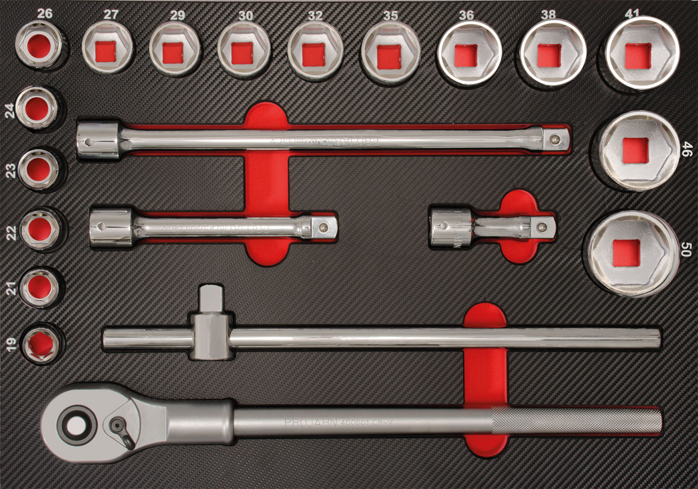 • 21-tlg. Werkstattwagen-Einlage mit metrischen Steckschlüsselwerkzeugen 20 [3/4″] nach DIN 3120 / ISO 1174