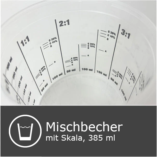 Unser Profi-Mischbecher aus transparentem und recycelbarem PP-Material bietet 385 ml Volumen – perfekt für das genaue Mischen mehrerer Komponenten. Mit einer deutlich lesbaren Skalierung wird das Risiko von Fehlern im Mischverhältnis minimiert. Die Skala deckt Mischungsverhältnisse von 1:1 bis 5:1 ab.