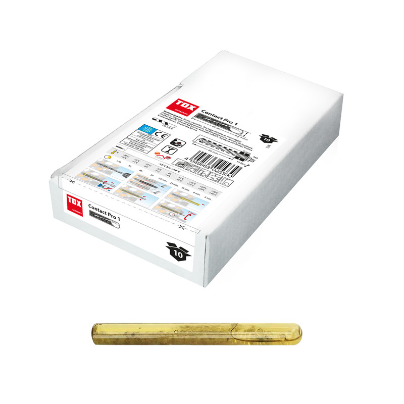 Der TOX-Verbundanker Contact Pro 1 Verbundanker ermöglicht durch die exakt vordefinierte Füllmenge je Bohrloch und der geringen Verankerungstiefe eine schnelle und unkomplizierte Anwendung. Er zeichnet sich durch höchste Belastbarkeit bei kleinem Bohrdurchmesser aus, ist bauaufsichtlich zugelassen und wasserdicht. Die Verbundanker-Glaspatrone, die voneinander getrennte Komponenten enthält, wird in Kombination mit der TOX-Gewindestange Stix verwendet. Der Anker ist ideal für die spreizdruckfreie Befestigung von Stahlkonstruktionen, Geländern, Hochregalen, Fußplatten, Stützen und Holzkonstruktionen.