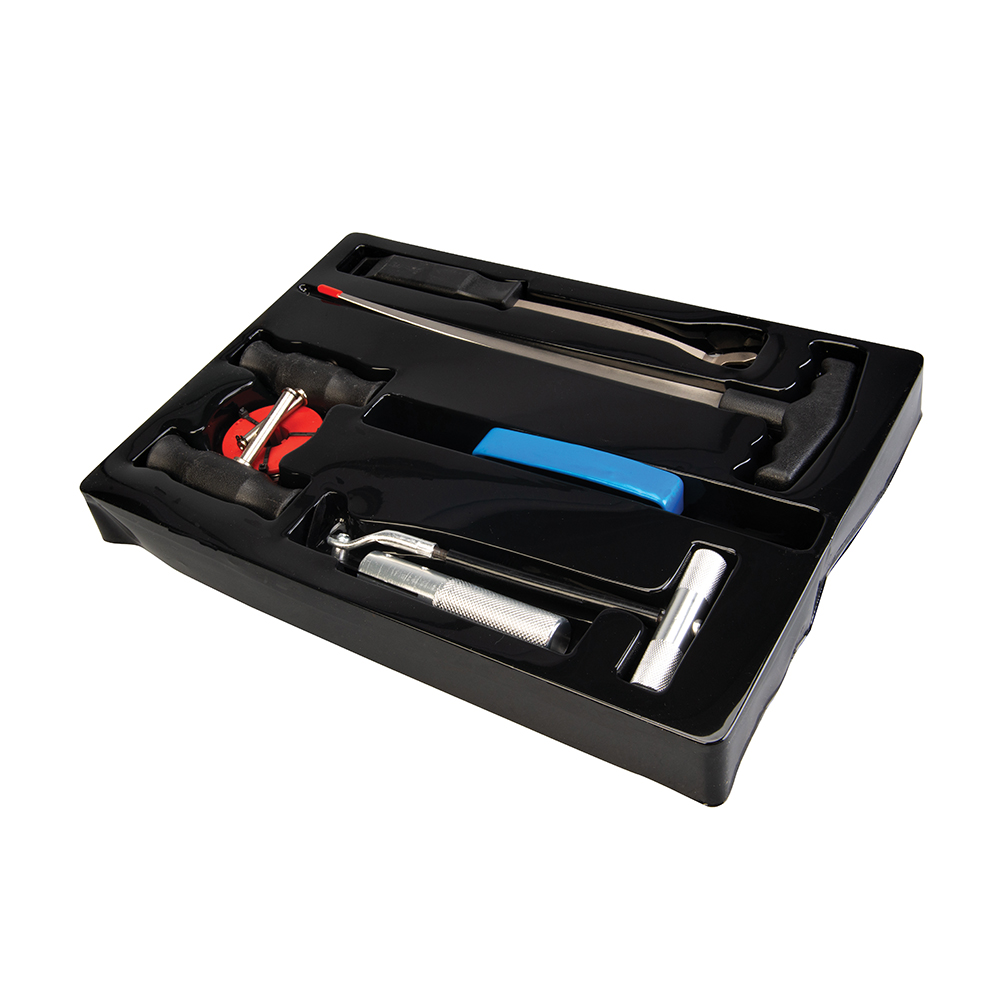 1 Schneidedraht 2 Drahtzuggriffe 1 Windschutzscheibenausbauwerkzeug 1 Windschutzscheibenrahmen-Lösewerkzeug 1 Drahteinziehwerkzeug 1 Verkleidungsabzieher 1 Werkzeugablage |